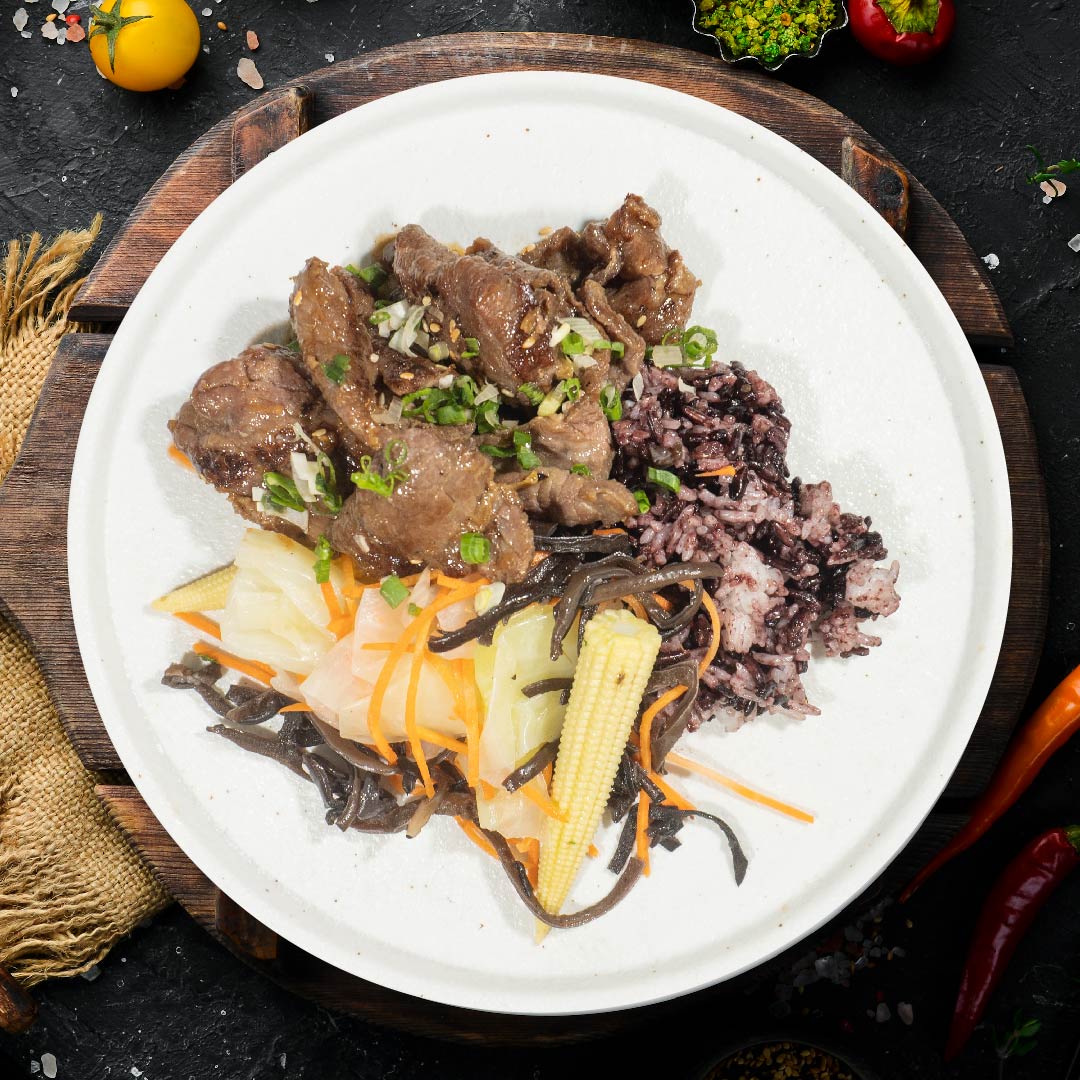 Korean Beef Bulgogi W/ Assorted Stir-Fry Vegetables And Purple Grain Rice