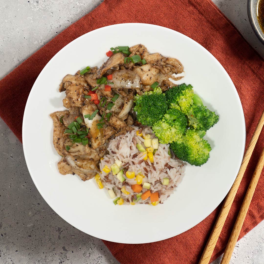 Black Pepper Chicken W/ Mix Onions, Seasonal Greens And Healthy Fried Rice