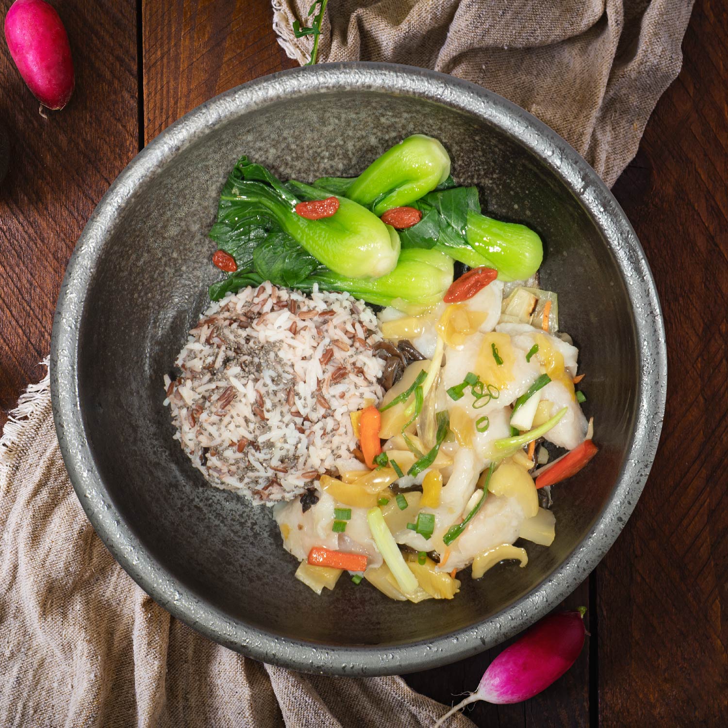 Stir Fry Fish Fillet In Sichuan Chillies And Pickles, Sauteed Greens And Mixed Grain Rice