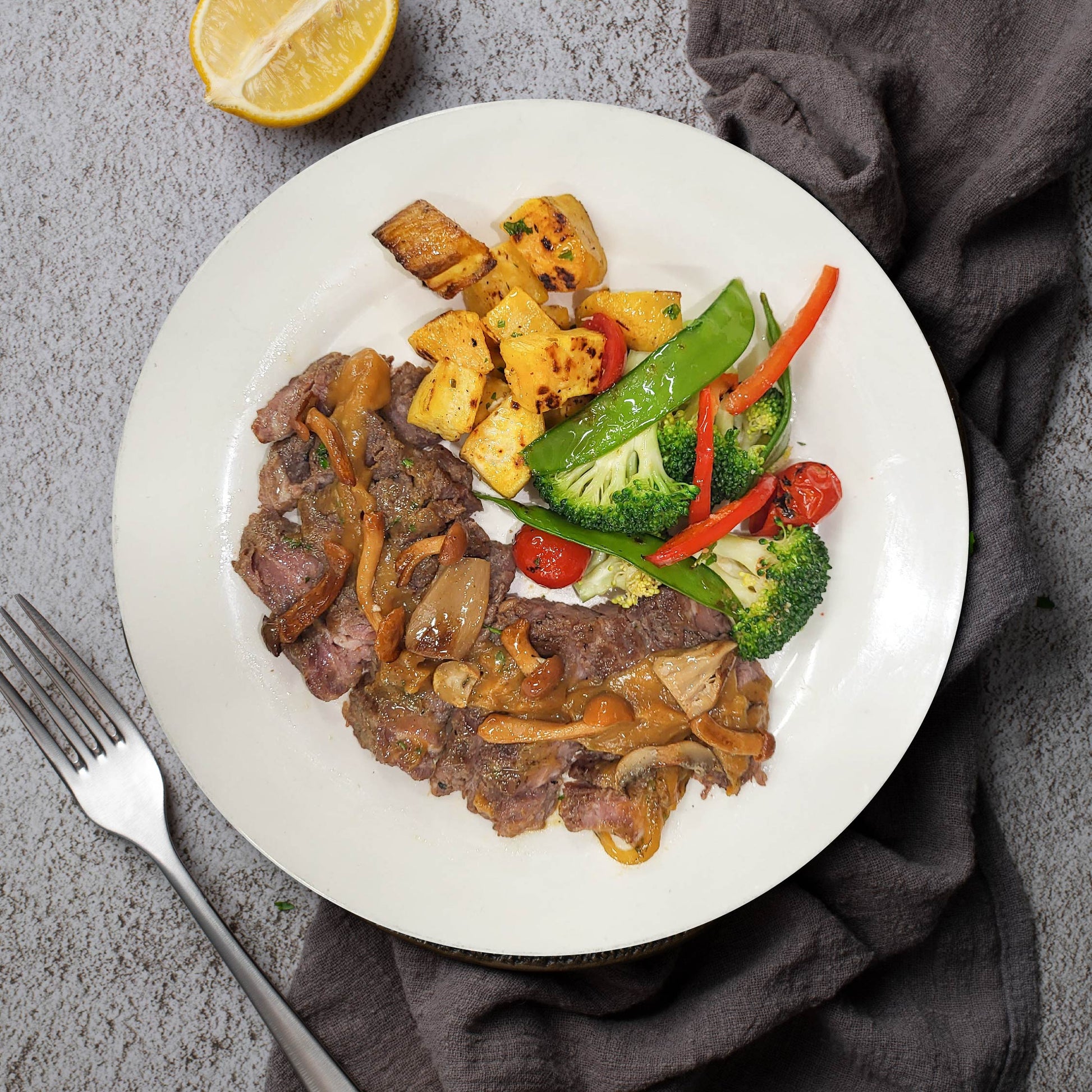 Grilled Rib Eye Steak W/ Sautee Vegetables, Baked Sweet Potato And Mushroom Sauce
