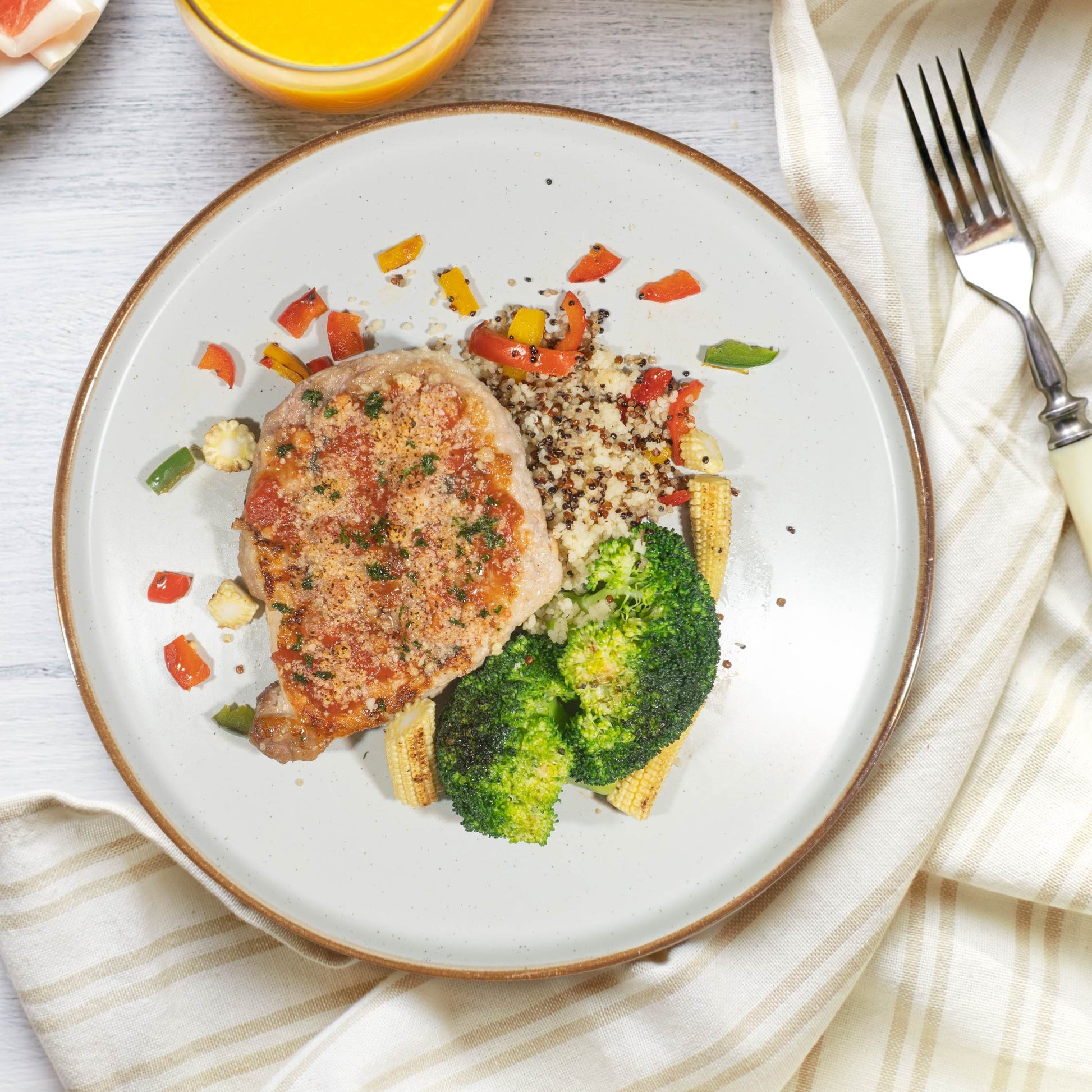 Oven Baked Pork Loin Milanese Served W/ Roast Vegetables And Italian Quinoa Cous Cous