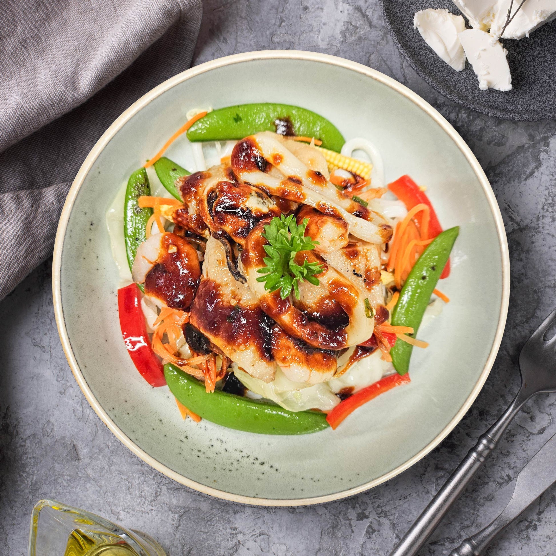 Mix Seafood Udon W/ Sautee Vegetables And Japanese Unagi Sauce