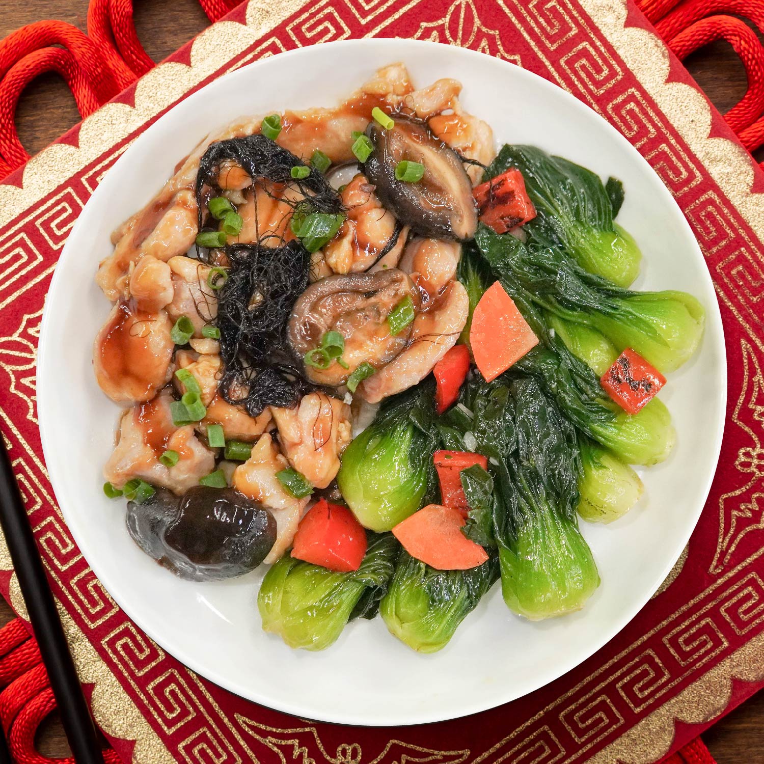 Braised Chicken W/ Assorted Mushrooms, Seasonal Vegetable