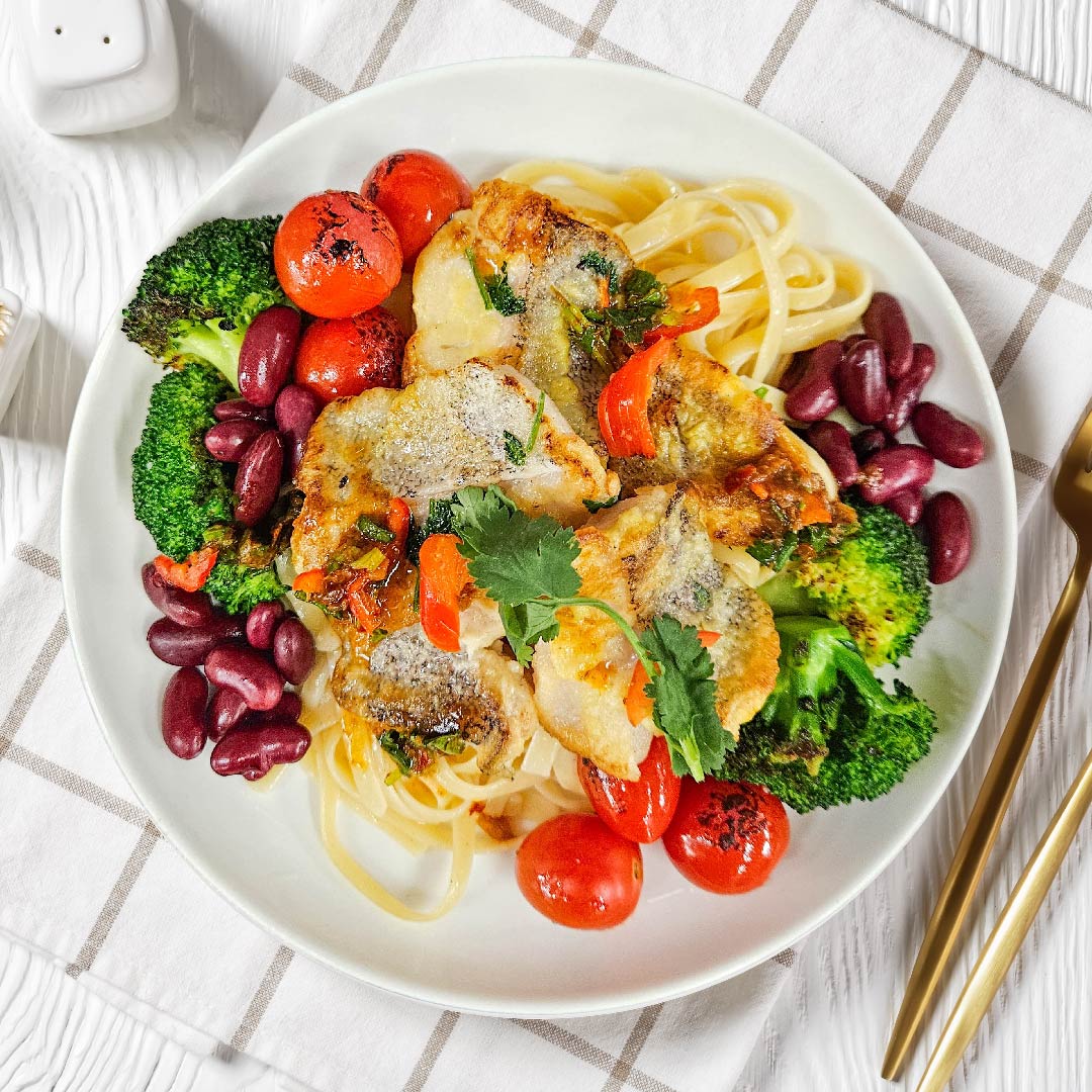 Grilled Snapper Fillet W/ Healthy Greens, Pasta And Salsa Verde