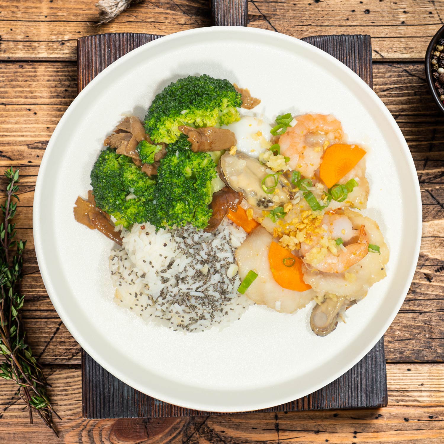 Sautee Ginger And Scallion Seafood W/ Asian Greens And Quinoa Rice