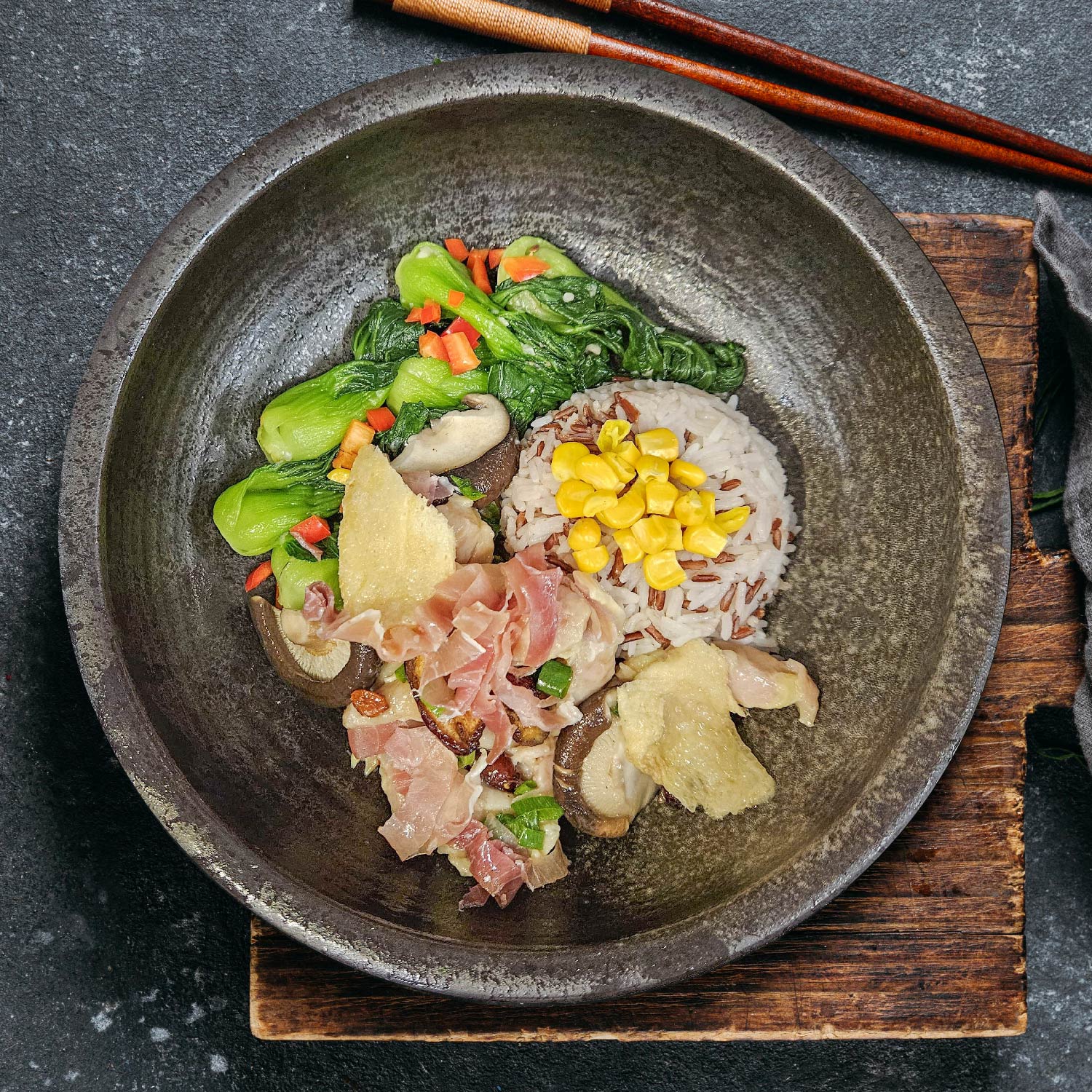 Braised Chicken W/ Mushroom, Bamboo Pith, Parma Ham And Seasonal Vegetables W/ Corn Mix Grain Rice