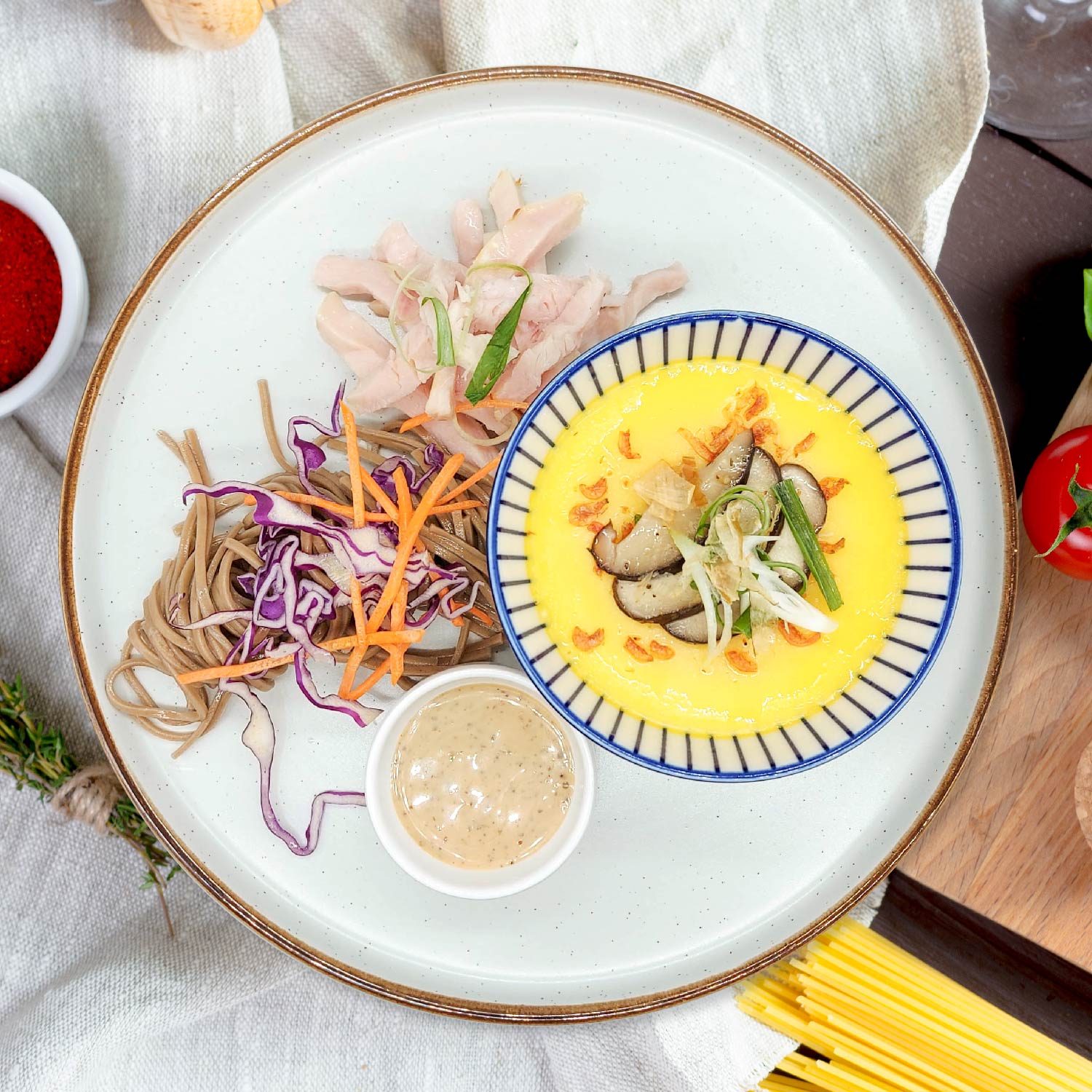 Japanese Steamed Egg Custard W/ Sakura Shrimp, Chicken Breast And Soba Salad