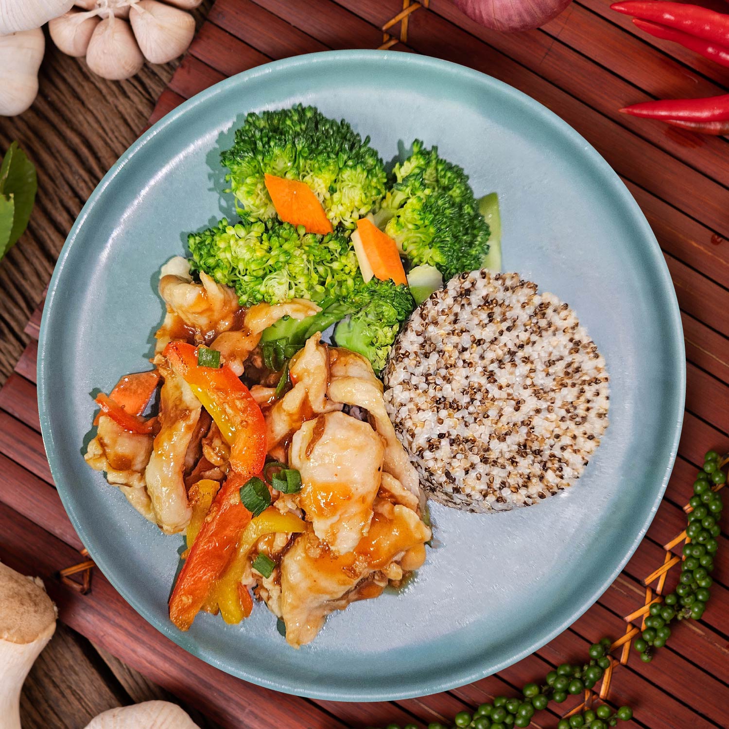 Braised Chicken w/ Sea Whelk in Abalone Sauce, Seasonal Vegetables And Quinoa Rice