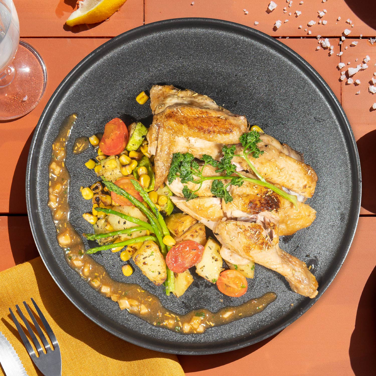 Macanese Style African Spring Chicken W/ Seasonal Vegetables And Mix Herbs Baked Potato