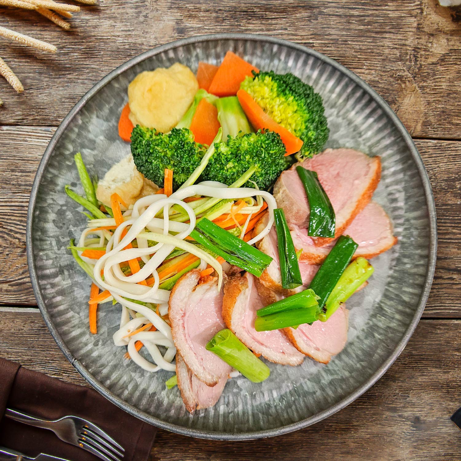 Braised Duck Breast W/ Plum Sauce, Seasonal Greens And Chinese Noodles