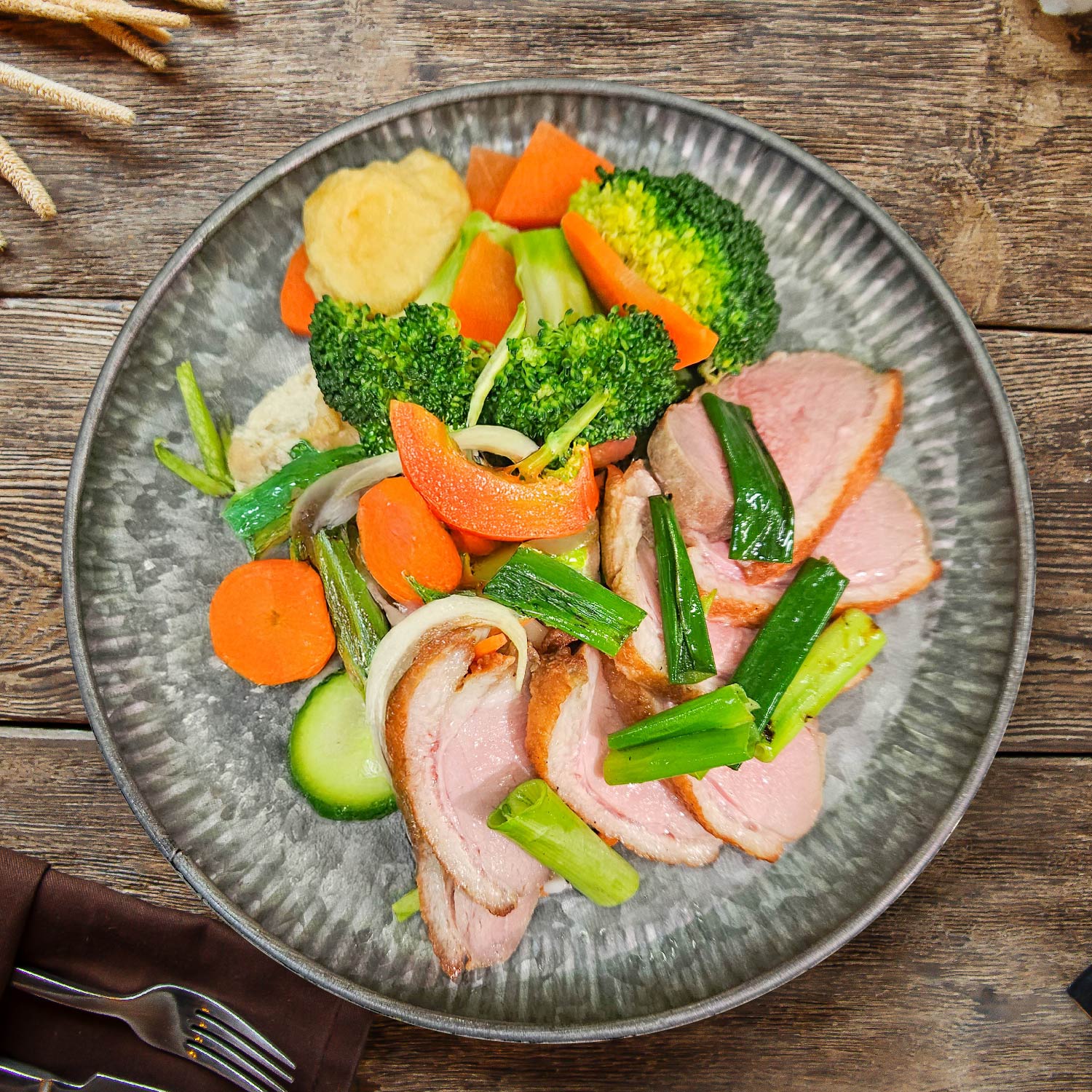 Braised Duck Breast W/ Plum Sauce, Seasonal Greens