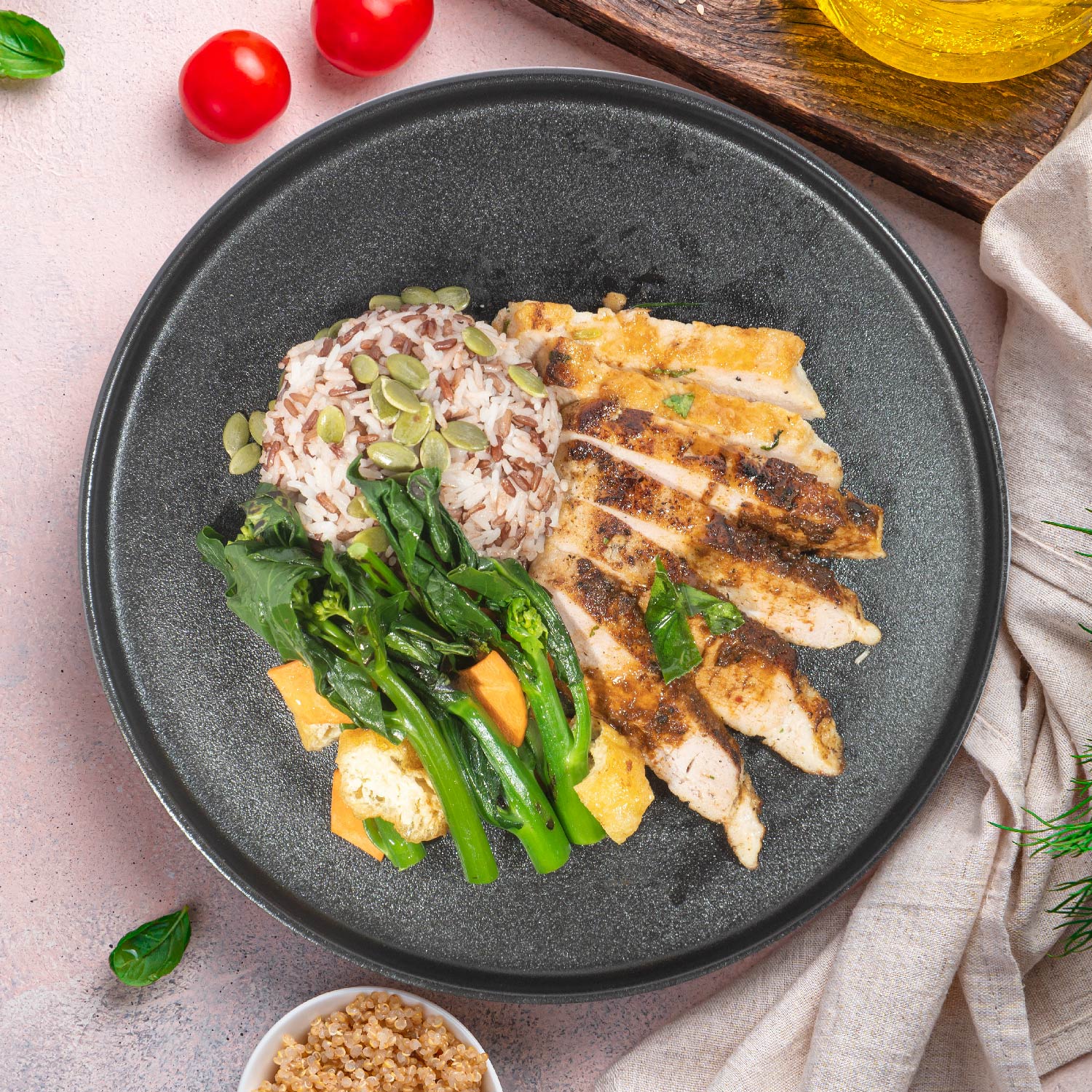 Balinese Style Bbq Pork Loin W/ Seasonal Vegetables And Pumpkin Seeds Mix Grain Rice