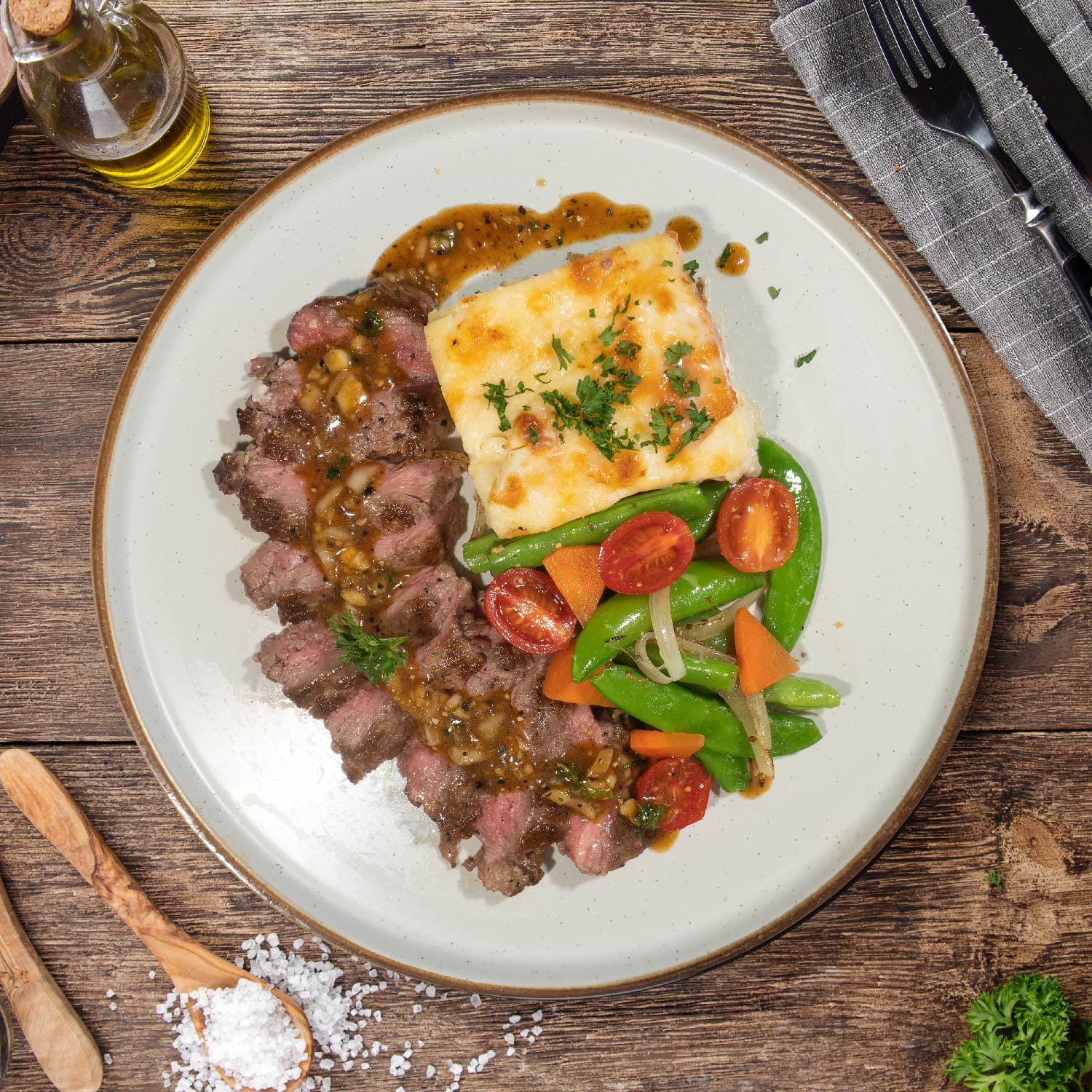 Grass Fed Ribeye Steak W/ Potato Scallopine, Sauteed Vegetables And Peppercorn Sauce