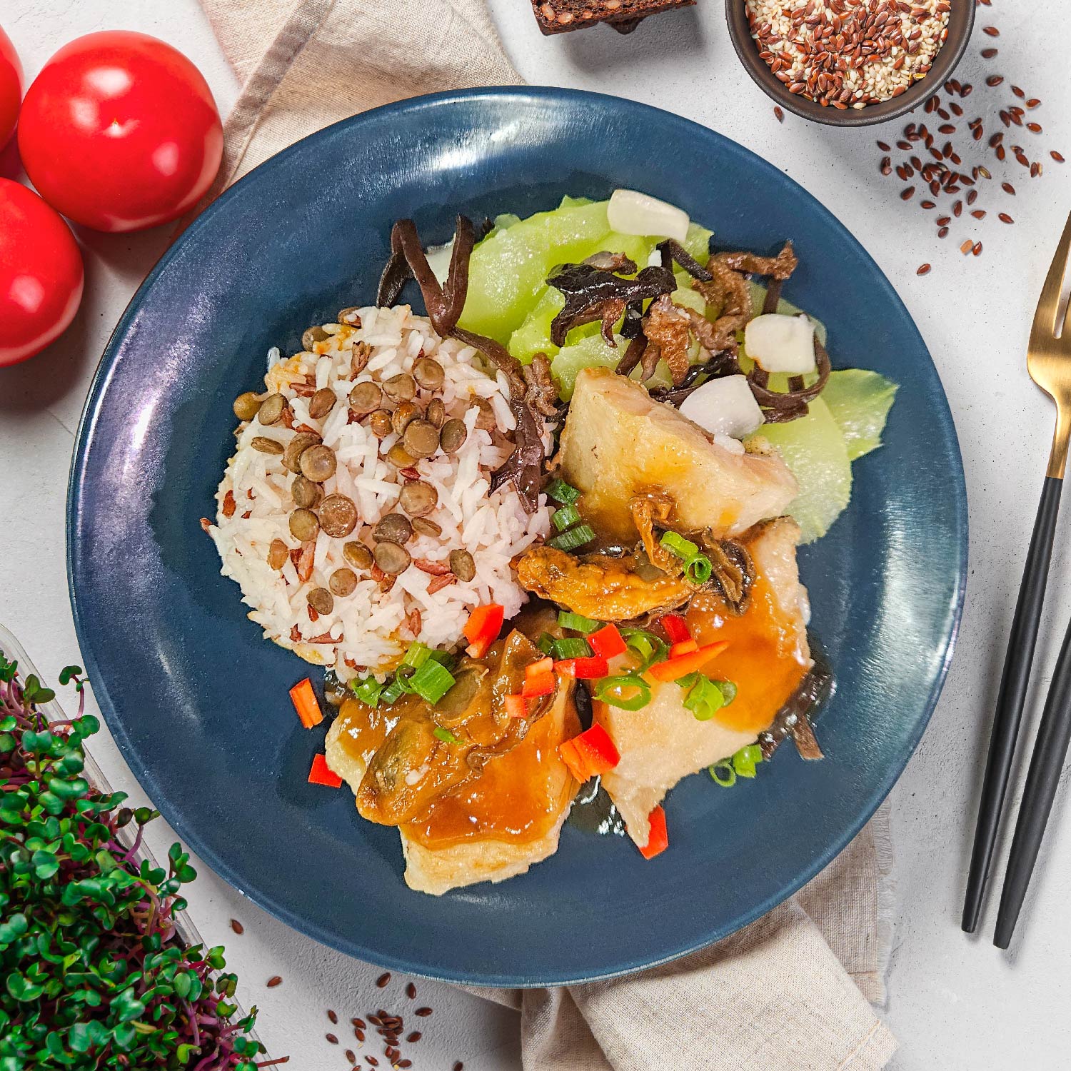 Braised Fish W/ Mushroom, Seasonal Vegetable And Lentil Rice