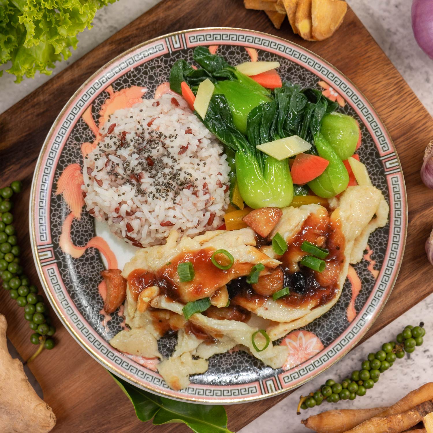 Black Bean Garlic Chicken W/ Asian Greens And Chia Seed Mix Grain Rice
