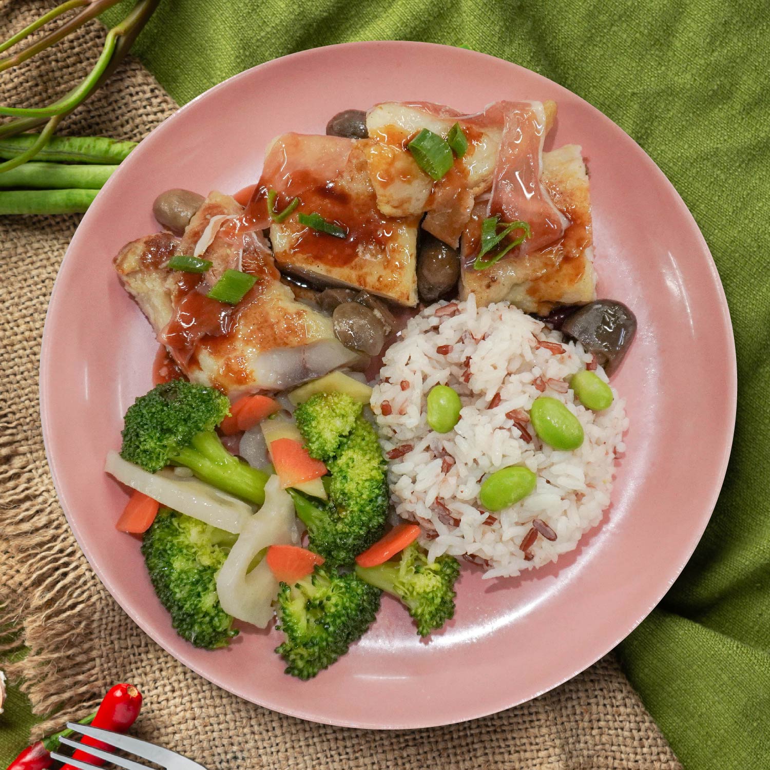 Parma Ham Braise Fish Fillet W/ Chinese Greens And Edamame Mix Grains