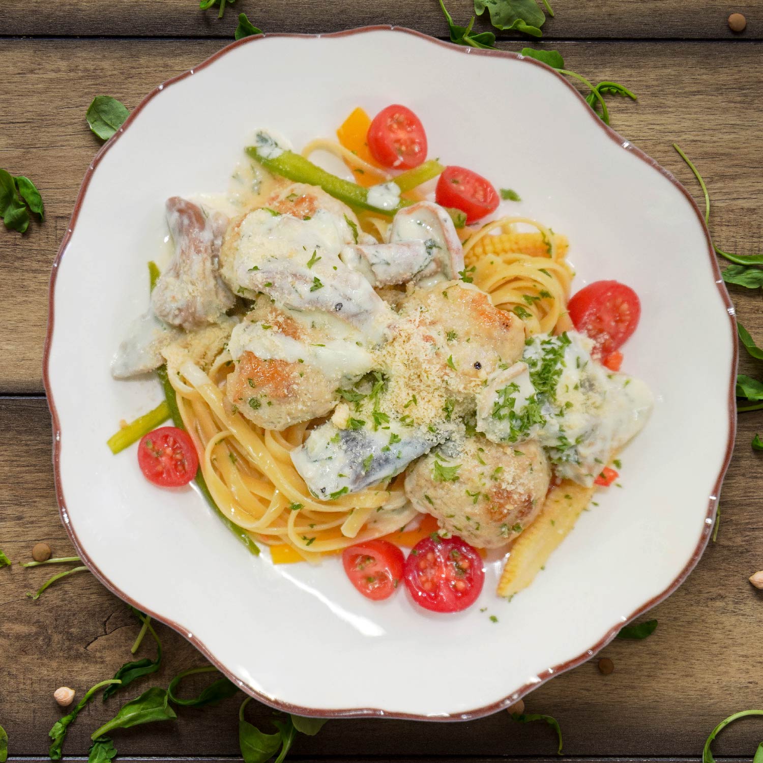 Healthy Chicken And Mushroom "Alfredo" W/ Seasonal Vegetable, Zoodles Mix Coodles