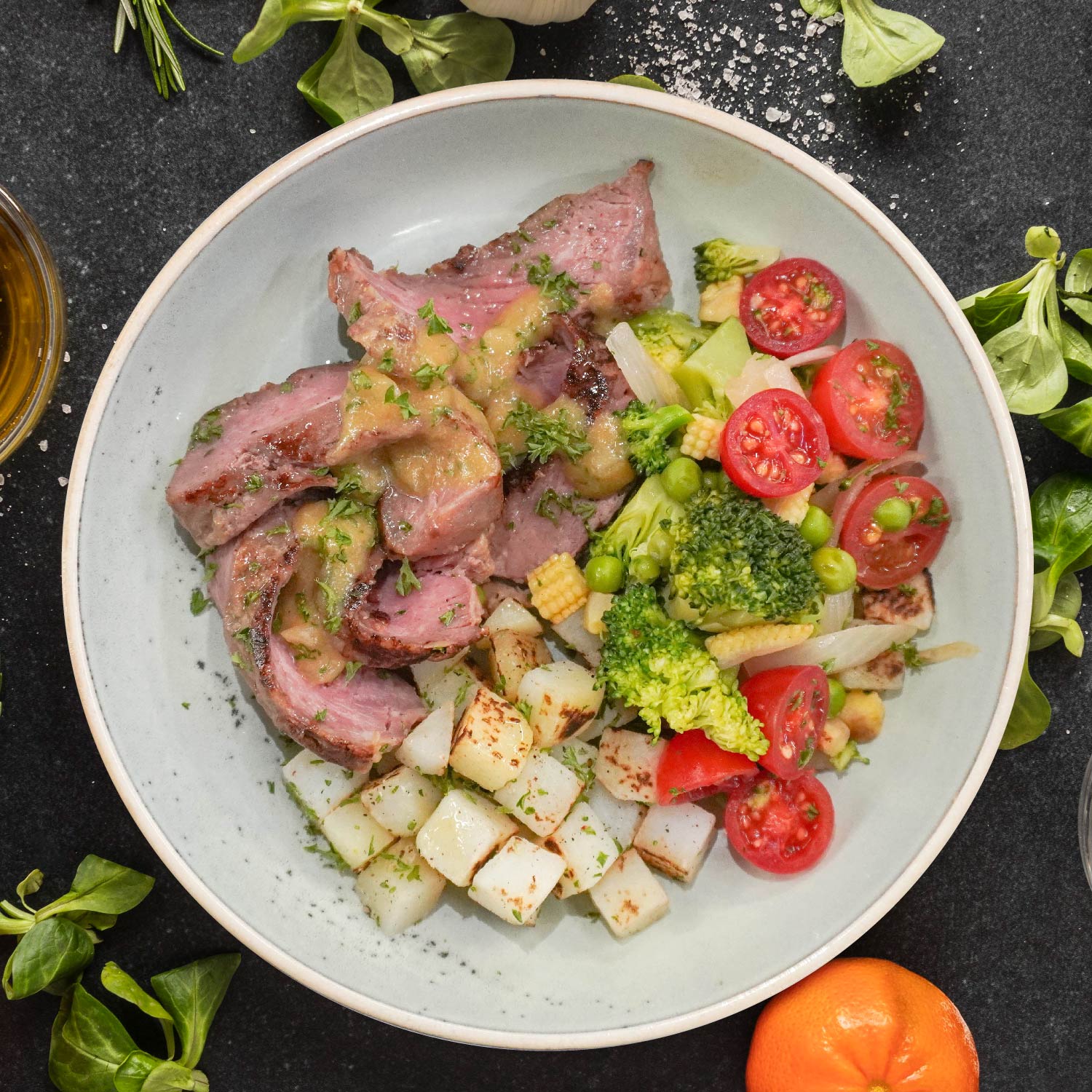 Grilled Ribeye W/ Seasonal Vegetables, Roast Potatoes And Dianne Sauce