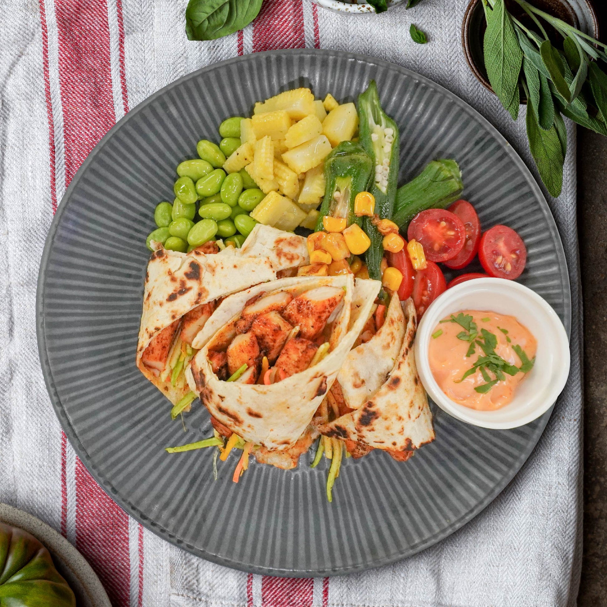 Grilled Chicken Tortilla Wrap W/ Mix Greens And Low Fat Sriracha Mayonnaise