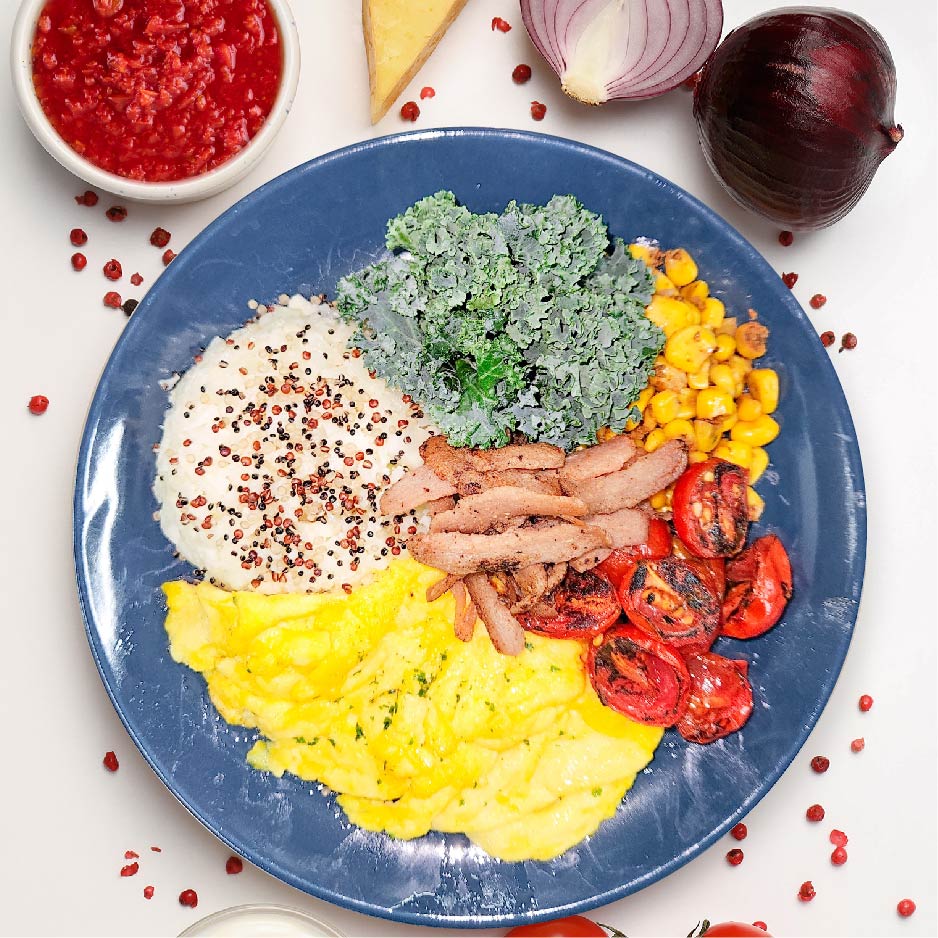 Start your day with a protein-packed low carb breakfast of Scrambled Eggs with OmniPork and Cauliflower Rice. Eggs are a great alternative to animal meat as they contain plenty of essential amino acids, whilst OmniPork, a plant-based protein source, is low in saturated fat and cholesterol.