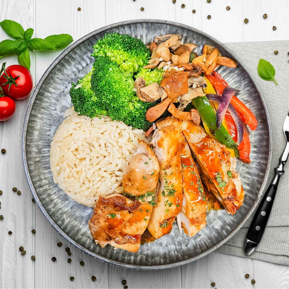 To create our Chicken Teriyaki served with seasonal greens and wholesome brown rice, we remove all skin and fat before grilling our chicken steak on our broiler before glazing the meat with our flavorful teriyaki sauce. The chicken serves as a lean protein source, vital for muscle maintenance. The soft nutty brown rice, a whole grain, provides complex carbohydrates, fiber, and essential nutrients that promote steady energy release, healthy digestion, and blood sugar control.