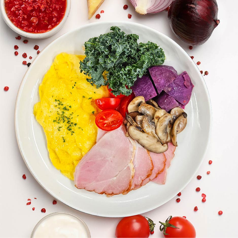 Start your day with our roasted gammon ham and mushroom Omelette with Sweet Potato. This protein-rich breakfast combines eggs, savory ham, earthy mushrooms, and roasted sweet potatoes. Eggs offer high-quality protein and essential vitamins, including B12 for brain function. While the sweet potatoes provide you energy and contain vitamins A and C, supporting immune health, and dietary fiber for digestive well-being.
