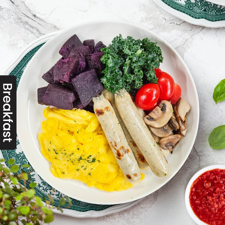 Optimize muscle gains with our Scrambled Eggs with Chicken Sausages and Sweet Potato. Eggs are a complete protein source, providing all essential amino acids necessary for muscle repair and growth. Our mixed herb chicken sausages offer lean protein to support muscle development, while sweet potatoes provide complex carbohydrates and vitamins that fuel intense workouts and promote muscle recovery.