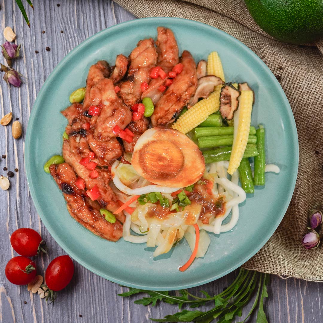 三杯雞配什椒、炒蔬菜、鹵蛋和中式麵條