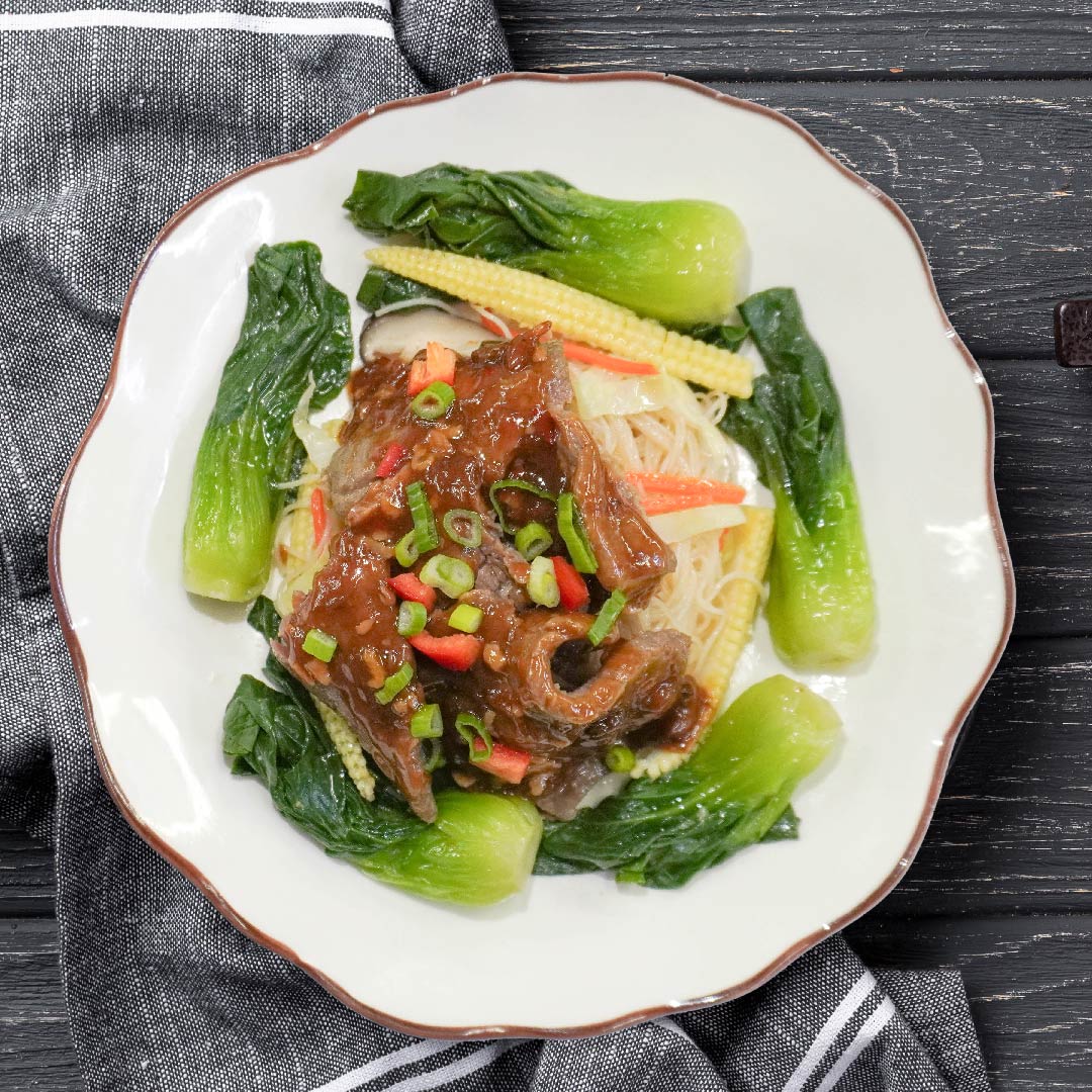 健康 Xo 牛肉配混合蔬菜和健康炒米粉