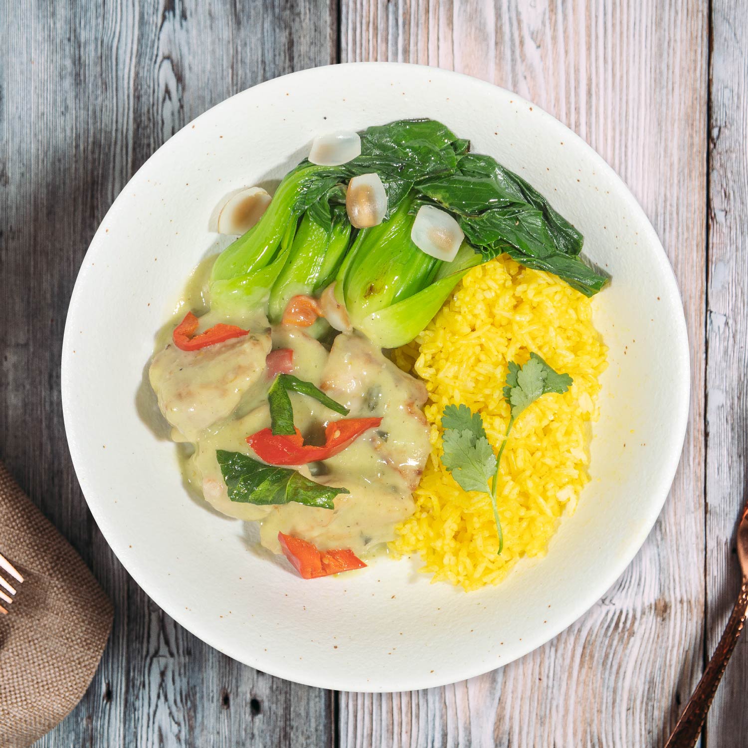 低脂泰式綠咖哩雞肉配亞洲蔬菜和椰子薑黃飯